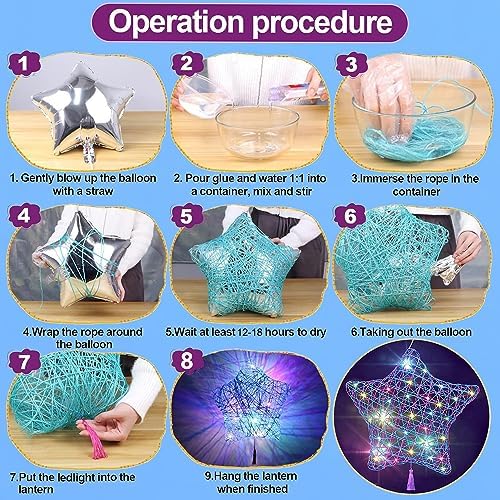 How to Make String Lantern: This kids crafts set comes with a step by step and easy to follow instruction guide. Inflate the star balloon, soak the string in the special glue, wrap it around the star, wait at least 12-18 hours let it dry, remove the balloon, and wow! You are all done! Use the hanging cord to hang up your star wherever you would like.