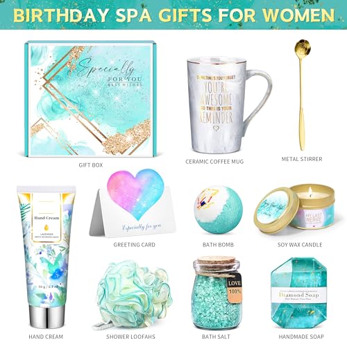 💖Perfect Gifts Idea For Women: Every item in our gift box is carefully selected inclubing: 1*14oz mug, 1*bath salts, 1* 3.5oz lavender scented candle,1*hand cream, 1*diamond handmade soap,1*bath bomb, 1*bath loofahs 1*gift box, 1*greeting card. A best wishes greeting card is included to write your blessing message freely give your loved ones an unparalleled experience.