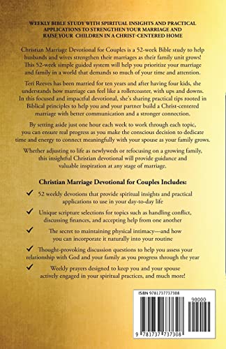 52 weekly studies that provide spiritual insights and practical applications to use in your day-to-day lifeUnique scripture selections for topics such as handling conflict, discussing finances, and accepting help from one anotherThe secret to maintaining physical intimacy — and how you can incorporate it naturally into your routineHow to find God in the everyday and embrace His decisions, even when they seem impossible to understandThought provoking discussion questions that will help you assess your own relationship with God and family as you progress through the yearWeekly prayers designed to keep you and your spouse actively engaged in your spiritual practicesHow to overcome unfaithfulness without breaking, even when it feels like it’s the last thing you can possibly manageSimple, practical action steps that will guide you on your journey to rediscovering love and joy in your marriage while raising your children with the Word of God