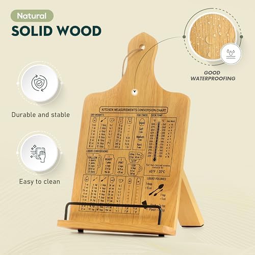 Cookbook Stand, Rustic Wood Cookbook Holder Cutting Board Style with Measurement Conversion Chart, Adjustable Recipe Ipad Tablet Book Holder and Stand for Kitchen with Anti-Slip Kickstand