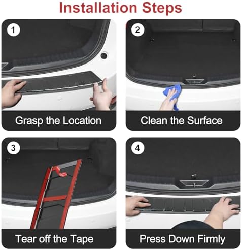Easy Installation: Wipe the trunk door sill clean and make sure the surface is clean and dry, Tear off the adhesive backing film, grasp the location where it needs to be pasted, stick the protection strip flat on its surface and press it evenly for a few seconds to make sure it is tight.