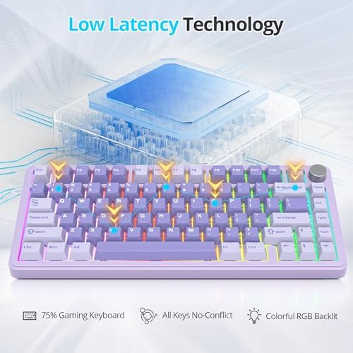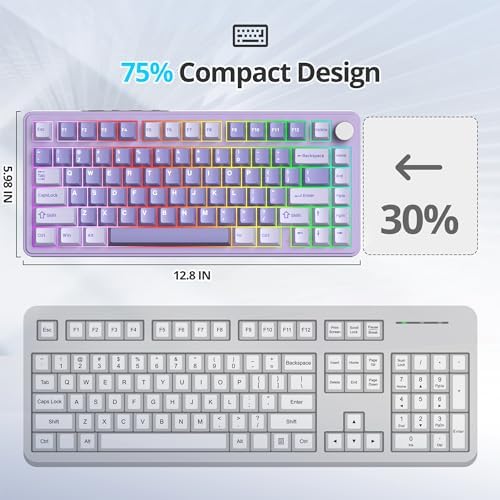 Fogruaden M75 RGB Hot-Swappable 75% Percent Wireless Mechanical Gaming Keyboard with Knob&Sound-Absorbing Pads, Gasket, NKRO TKL Custom Creamy Purple Keyboard, BT/2.4GHz/Wired, Linear White Switches