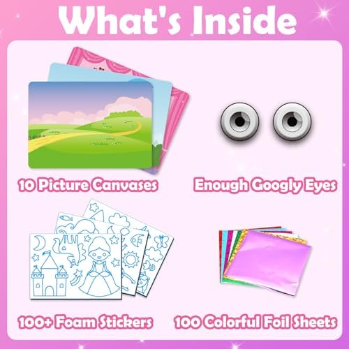 Easy to Use: Choose – Peel – Press – Stick – With just 4 simple steps, you can effortlessly create an enjoyable piece of art. It includes over 100 colorful foam stickers, 100 colored foil sheets, 10 canvases, 30 pairs of eyes, and an instruction manual.