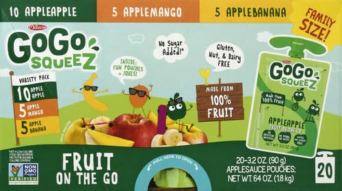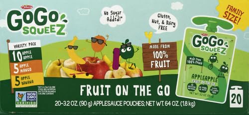 Stock your pantry or fridge with this pack of 20, 3.2 ounce kid-approved snack pouches (3 flavors to choose from); GoGo squeeZ Fruit on the Go squeeze pouches are kitchen pantry safe (no refrigeration required)