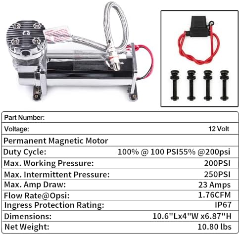 【Product Specifications】The maximum voltage is 12V, and the maximum work pressure is 200 PSI. AMP is drawn to 23 amp, the flow velocity (0 PSI) is 1.7cfm, and the product size is 10-3/4 “x 4” x 6-3/4 “.