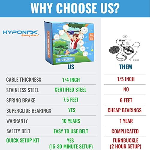 Hyponix Zip Lines for Kids and Adults Outdoor up to 350 Lbs – 180 ft – 15 Minute Quick Setup Kit – 100% Rust Proof | Zipline for Backyard Kids and Adults | Zipline Kits for Backyard
