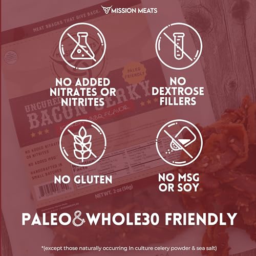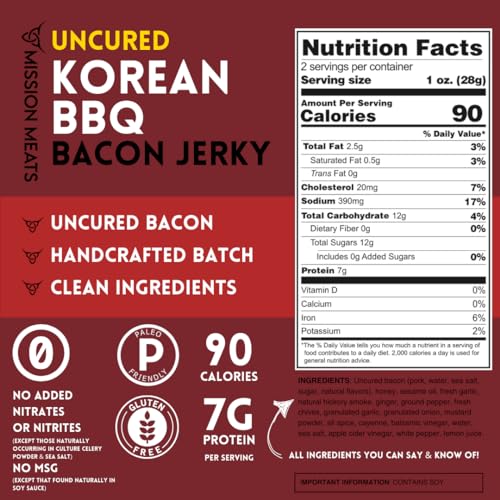 Mission Meats Delicious Uncured Korean BBQ Bacon Jerky Hand Crafted Small Batch Gluten Free MSG Free Nitrate Nitrite Free Paleo Healthy Snacks Natural Meat Sticks Beef Sticks Protein Snacks