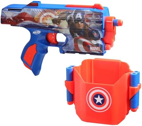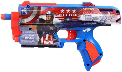 NERF MARVEL CAPTAIN AMERICA BLASTER: Head into heroic adventures with this eye-catching blaster that features Captain America designs on both sides
