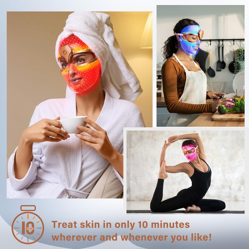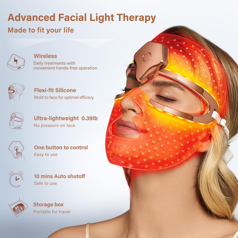 Wireless led face mask light therapy is made of flexible silicone with soft points that keep the skin breathable during the treatment.Ultra-lightweight only 0.39Ibs, cordless and adjustable non-slip head strap for universal fit, fitting into busy active lifestyle, make it a convenient treatment at home or on the go. Auto shutoff treatment without overexposure. Come with the box contains to keep mask properly stored.