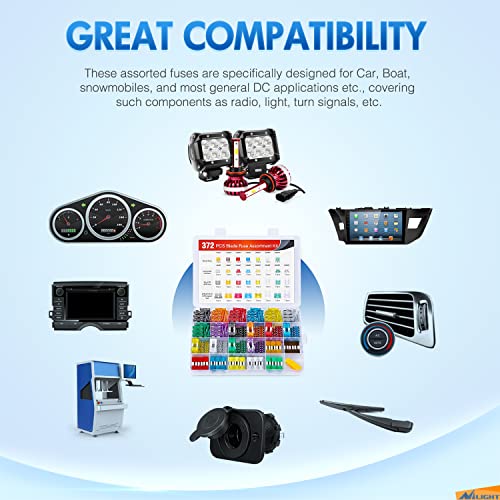 Nilight 4 Types Blade Fuses Micro2 (APT, ATR) : 5A/7.5A/10A/15A/20A/25A/30A Low Profile-Mini (APS, ATT): 2A/5A/10A/15A/20A/25A/30A/35A Mini(APM, ATM) : 2A/5A/10A/15A/20A/25A/30A/35A Regular(APR, ATC, ATO, ATS) : 2A/5A/10A/15A/20A/25A/30A/35A 12 PCS for each amp rating, total 372pcs Wide used for Cars, Trucks, SUVs, ATVs, UTVs, Campers,RVs, Motorcycles,Golf Car, Boats, snowmobiles, and most general DC applications etc. covering such components as radio, light, turn signals, etc.