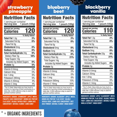 HEALTHY SNACKS FOR ADULTS AND KIDS: Contains 6 Strawberry Pineapple, 6 Blueberry Beet and 6 Blackberry Vanilla fruit smoothie pouches.