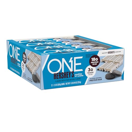 ONE Protein Bars, Hershey’s Cookies ‘n’ Creme, Gluten Free with 18g Protein and 3g Sugar, Pantry Staples, 2.12 oz (12 Count)