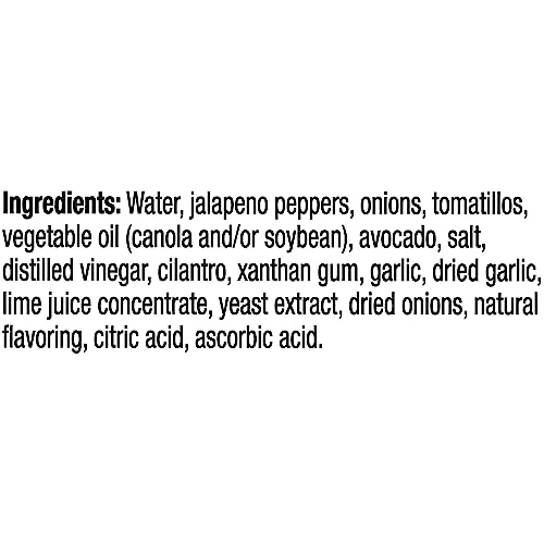 Ingredients: Water, Jalapeno Peppers, Onions, Tomatillos, Vegetable Oil (Canola And/Or Soybean), Avocado, Salt, Distilled Vinegar, Cilantro, Xanthan Gum, Garlic, Dried Garlic, Lime Juice Concentrate, Yeast Extract, Dried Onions, Natural Flavoring, Citric Acid, Ascorbic Acid.