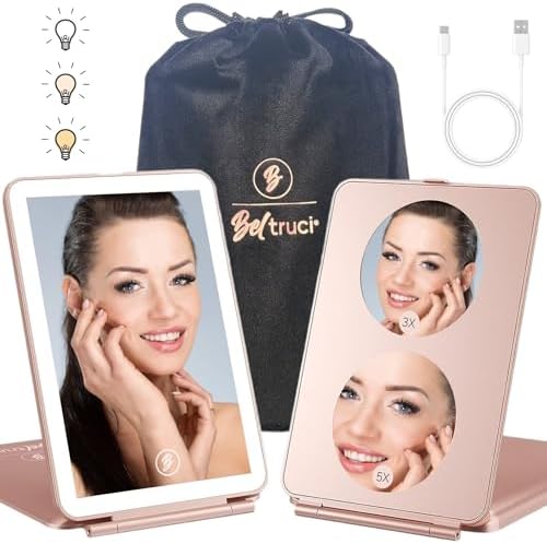 [MAGNIFICATION 1x 3x 5x] Beltruci travel mirror features a 1X magnification mirror with light, enabling you to see every detail and achieve a professional makeup look. Magnifying Magic – simplify precision makeup with 3X and 5X Magnifying Glasses.