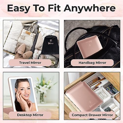 Rechargeable Travel Makeup Vanity Mirror, Led Lights, Portable, Dimmable with 3 Lighting Modes, Magnification, Tabletop Folding Cosmetic Mirror with Storage Bag, Rose Gold