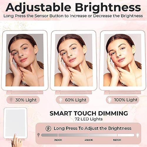 [3 COLOR LIGHTS Portable Travel Makeup Mirror] this lighted travel makeup mirror with 72 LEDs, offers white lights, warm lights and cool lights. Easily switch the color temp between a warm glow to white glow to see how exactly your makeup will look in various lighting situations like daytime, evening, and working environments. The led light is natural and soft, bright but not dazzling to provide you with a clear reflection, can light the most dark and poorly lit areas to achieve a flawless professional makeup.