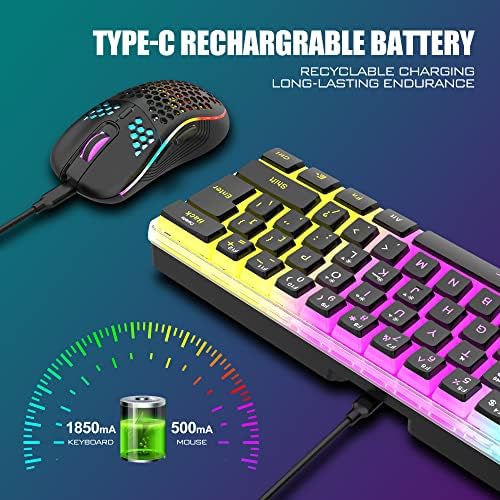 【Light Up Keyboard and Mouse】60 percent rgb gaming keyboard features 4 RGB backlight modes, 4 levels of brightness adjustment, 7 monochrome backlight modes and 1 full rainbow backlight. The luminous design of Letters and gaps makes it the best light up wireless mini keyboard on the market. The mouse has a built-in 7-color cyclic gradual lighting effect.