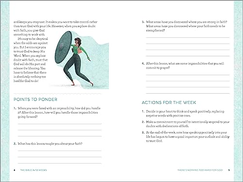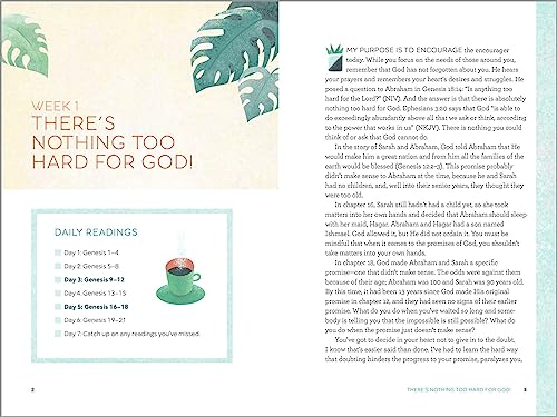 Themed readings―All verses for a given week tie together with themes that relate to modern women, like persevering through challenges, moving on from mistakes, and more.