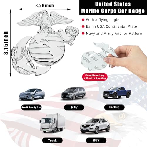 US Marine Corps Car Emblem, 3D USMC Military Hawk Globe Anchor Auto Badge Sticker, Universal Vehicle Exterior Decor Accessories for Car, Truck, Pickup, Motorcycle, Laptop (Silver)