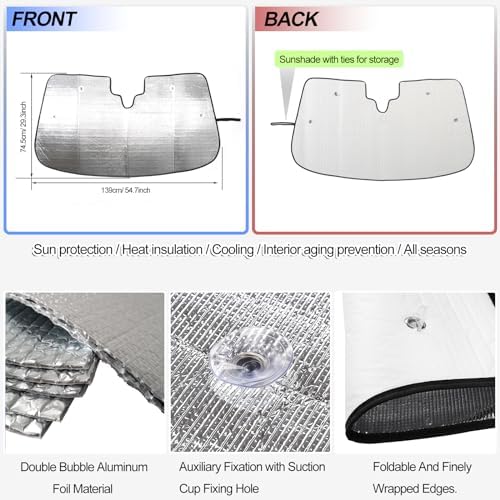 🏎️『Durable』: The Window Reflector Visor is made out of (Bubble Aluminum Foil) double-thick insulation and is reversible. The durable construction ensures that the windshield cover will last you summer after summer to provide years of cooler and more comfortable conditions inside your vehicle.