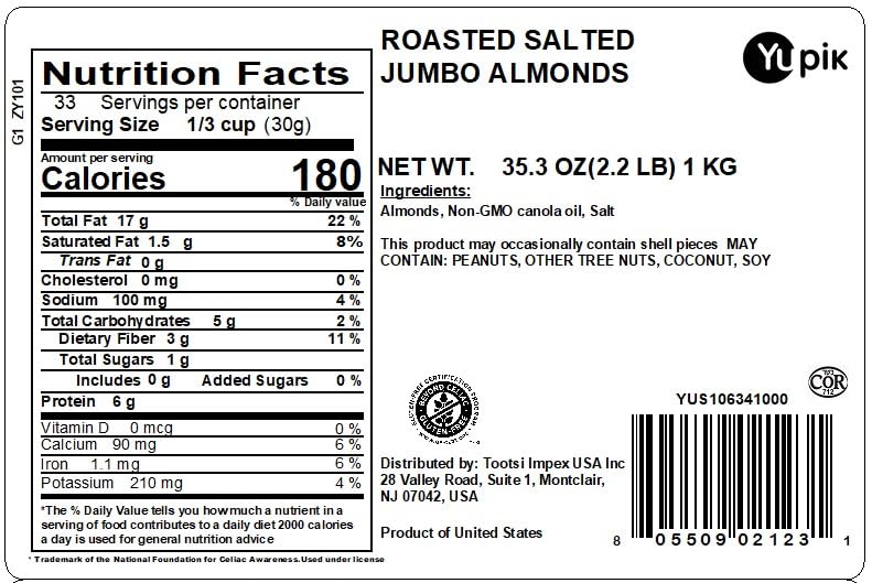 Yupik Roasted Salted Jumbo Almonds, 2.2 lb, Kosher, Gluten-Free, Large Almonds, Seasoned Nuts, Lightly Roasted, Salty Flavor, Source of Fiber & Protein, Crunchy, Savory Snacks